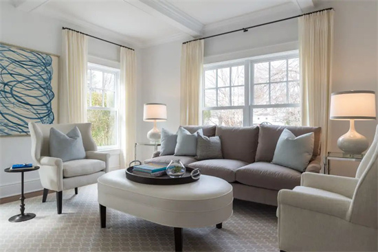 优雅的冰川灰空间,纯净的柔和蓝靠包,当蓝调与灰色调相碰撞,给空间带来的是宁静中正的韵味。没有太过跳跃的色彩,顶多加入一些明亮的金属色泽装饰品,或搭配温暖的晚霞色窗帘,这些活泼的因素却被沉静的烟灰色沙发和地毯所吸收。空间依旧淡雅与平和。