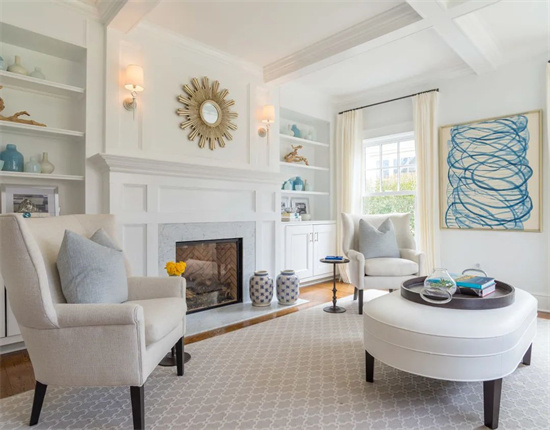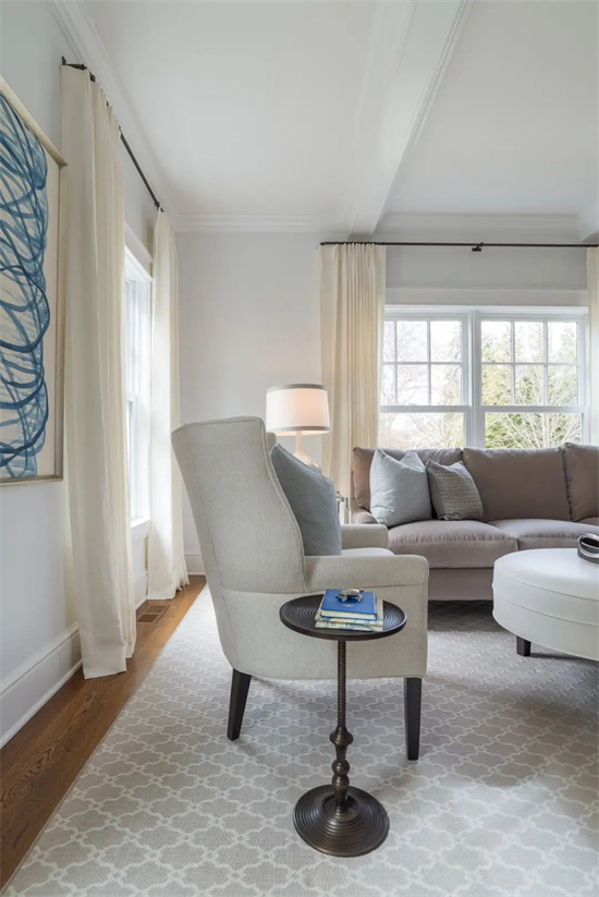 这是间不规则形状的小客厅,银色与白色的组合看起来精致高雅,尤其是在扇形落地窗赋予了空间充足的自然光的情况下。钢灰色的粗织地毯起到了功能分区的作用,同时鲜明的纹理起到了良好的装饰效果,上方叠放的不规则形状地毯丰富了层次。米克诺斯蓝的天鹅绒沙发上摆满了图案精美的靠枕,这些靠枕的色彩与空间完美契合。一对曙光银的布艺扶手椅在丰富质感的同时与周围环境构成良好的层次。